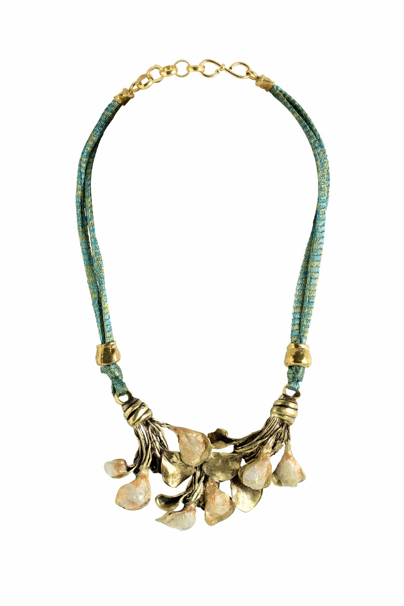 Collier van brons en messing met halve edelstenen. Het collier draagt