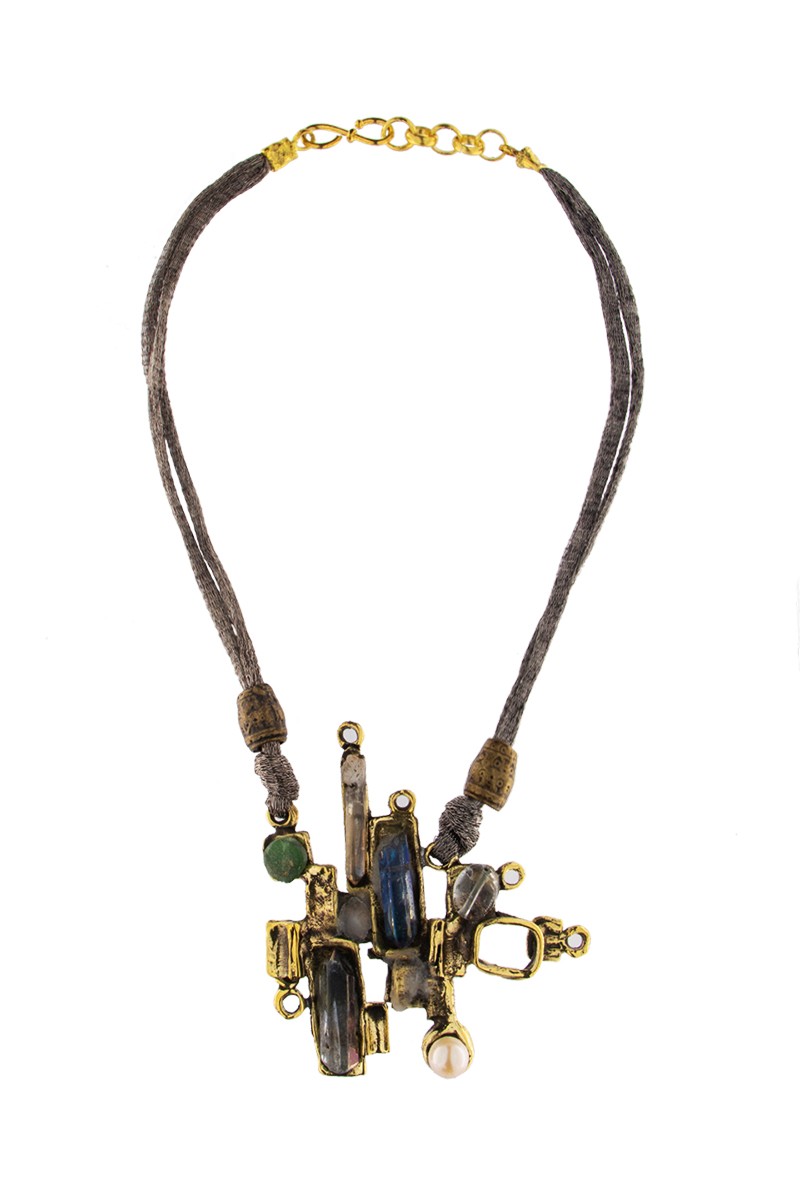 Collier van brons en messing met halve edelstenen. Het collier draagt