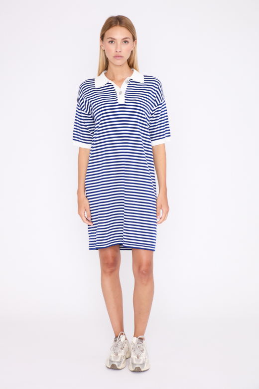 De JEFF jurk Clea voor dames is een zomerse essential die stijl en comfort moeiteloos combineert. Het gestreepte design geeft de jurk een frisse, moderne uitstraling, terwijl de knielengte zorgt voor een tijdloze en draagbare look. De polo-kraag en korte mouwen maken deze jurk perfect voor warme dagen, met een subtiel sportief accent.