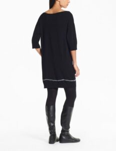 Deze knielange jurk combineert strakke lijnen met verfijnde details. De Italiaans afgewerkte boothals en subtiele ribaccenten zorgen voor een elegante uitstraling. Aan de zoom geeft een intarsiastreep de jurk extra diepte en een moderne twist. Dankzij het one-size breiwerk vormt de jurk zich soepel naar verschillende lichaamstypes en biedt hij ultiem draagcomfort. Perfect als veelzijdige damesjurk voor zowel casual als meer geklede gelegenheden.