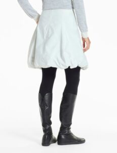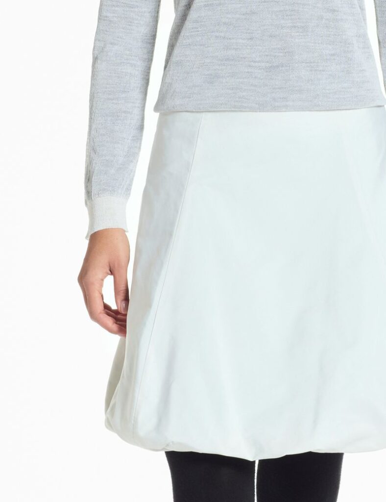 Deze damesrok boven de knie is vervaardigd uit duurzaam polyester canvas en combineert stijlvolle vormgeving met praktisch comfort. Het royale volume en de gedefinieerde lijnen geven de rok een architectonische uitstraling, geïnspireerd op winterjassen. De elastische tailleband zorgt voor een comfortabele pasvorm en houdt warmte vast, waardoor de rok ideaal is voor de koelere maanden.