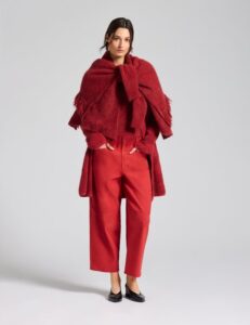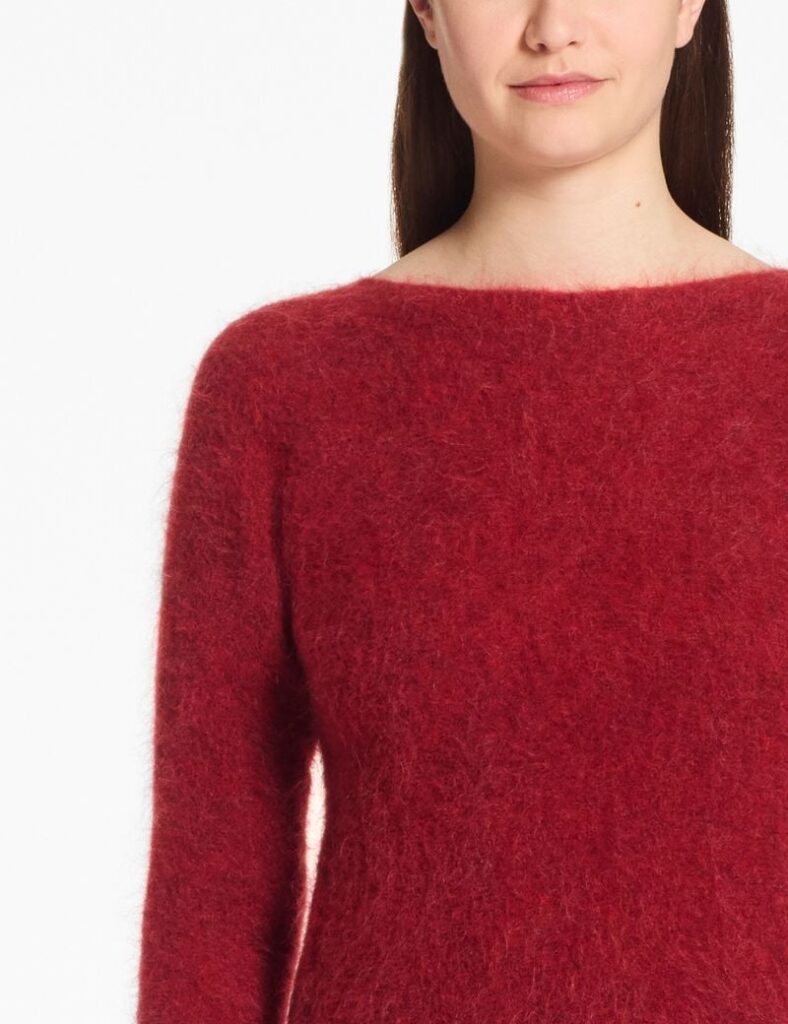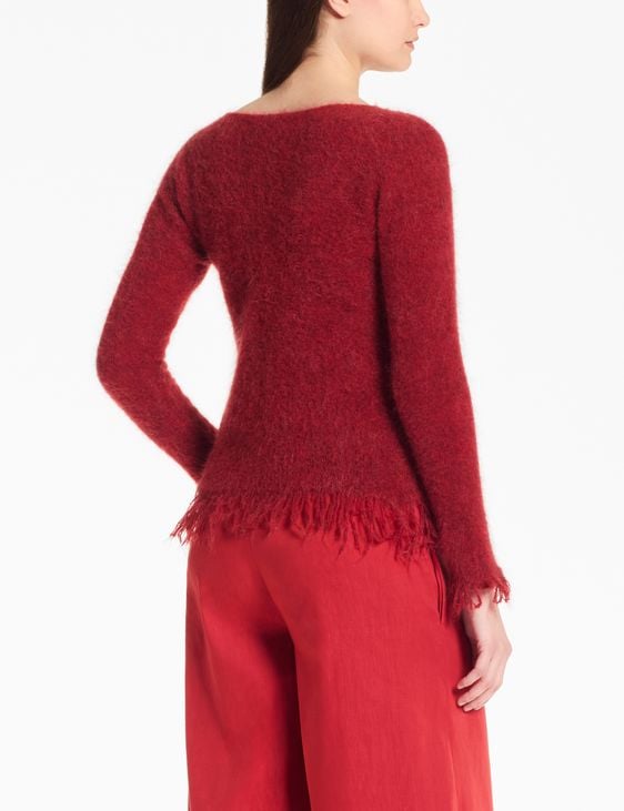 Deze mohair damestrui met boothals is een stijlvolle toevoeging aan iedere garderobe. Het zwierige silhouet en de vrouwelijke details maken deze trui geschikt voor zowel dagelijks gebruik als voor een elegante outfit. De mix van vervilt mohair zorgt voor behaaglijke warmte zonder zwaar aan te voelen, ideaal als lichte warme trui voor het najaar en de winter. De franjes langs de zoom geven de trui een subtiel, vrouwelijk accent.