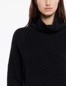 Deze trui met kol is gemaakt van een luxueuze mix van mohair en merinowol, wat zorgt voor een zachte, vloeiende textuur met veel draagcomfort. Het lange model en de subtiele details maken dit stuk zowel elegant als veelzijdig.