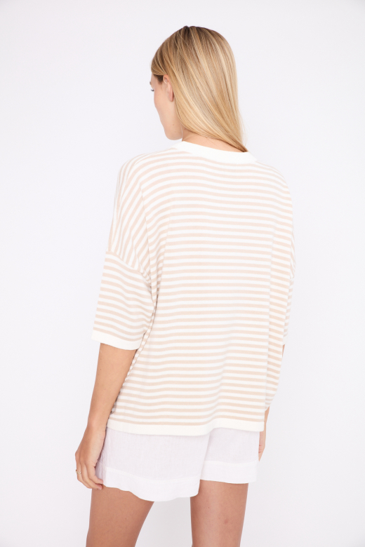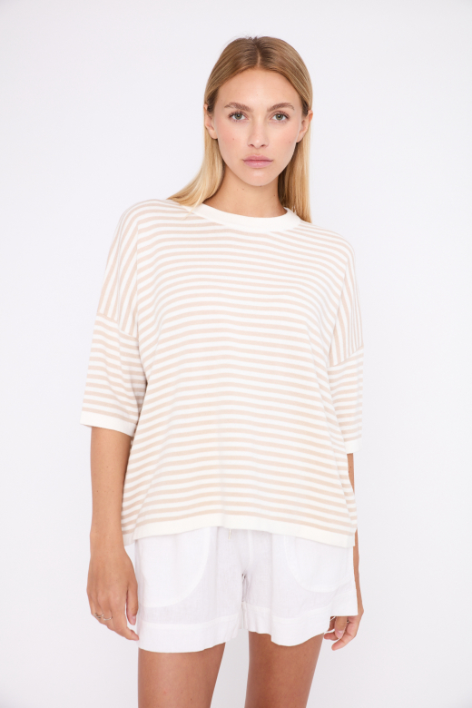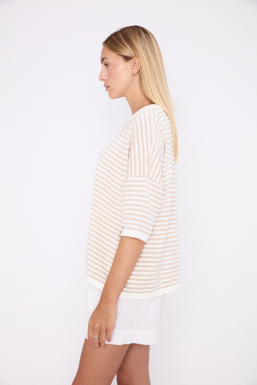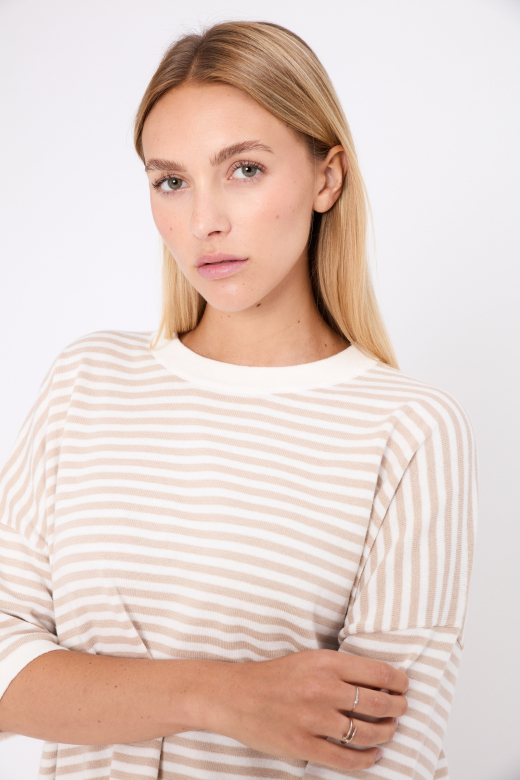 De JEFF trui Casimir voor dames is een stijlvolle en comfortabele essential met een tijdloze uitstraling. Het losvallende model zorgt voor een ontspannen en vrouwelijke fit, terwijl de ronde, aangesloten hals het silhouet mooi in balans houdt. Dankzij de korte mouwen is deze gestreepte trui perfect voor het voorjaar en de zomer, maar ook ideaal om te combineren in laagjes.