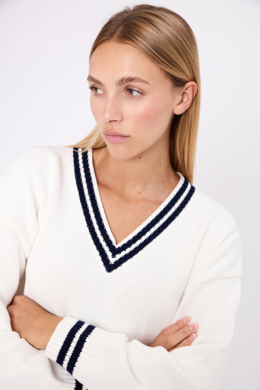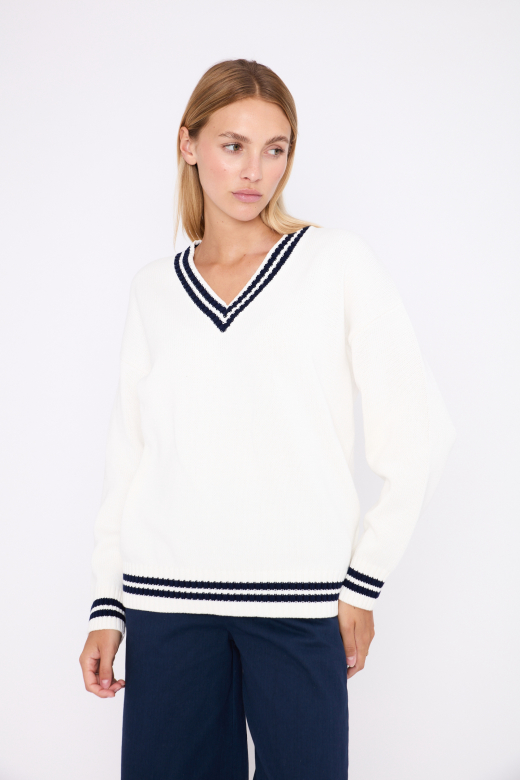 Witte trui met strepen bij de V-hals en boorden