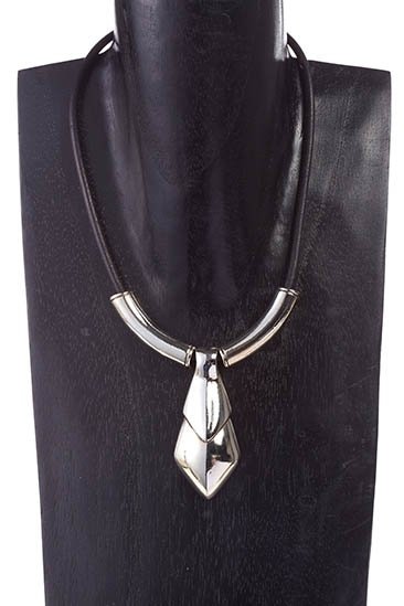 Collier van leer met zwaar verzilverde elementen. De lengte van het leer is 38cm. Het hangende element is 6cm lang.