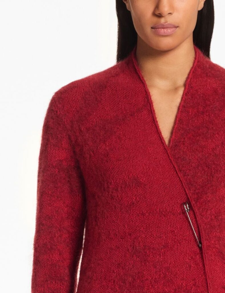 Deze lange cardigan heeft een elegante, ontspannen pasvorm met verlaagde schouders en een minimalistische veiligheidsspeldsluiting. De luxueuze mix van viscose, superkid-mohair en extrafine merinowol zorgt voor een zijdezachte drapering en uitzonderlijk draagcomfort. Het delicate jacquardbreisel voegt subtiele structuur en visuele diepte toe, waardoor dit item een verfijnde uitstraling krijgt.