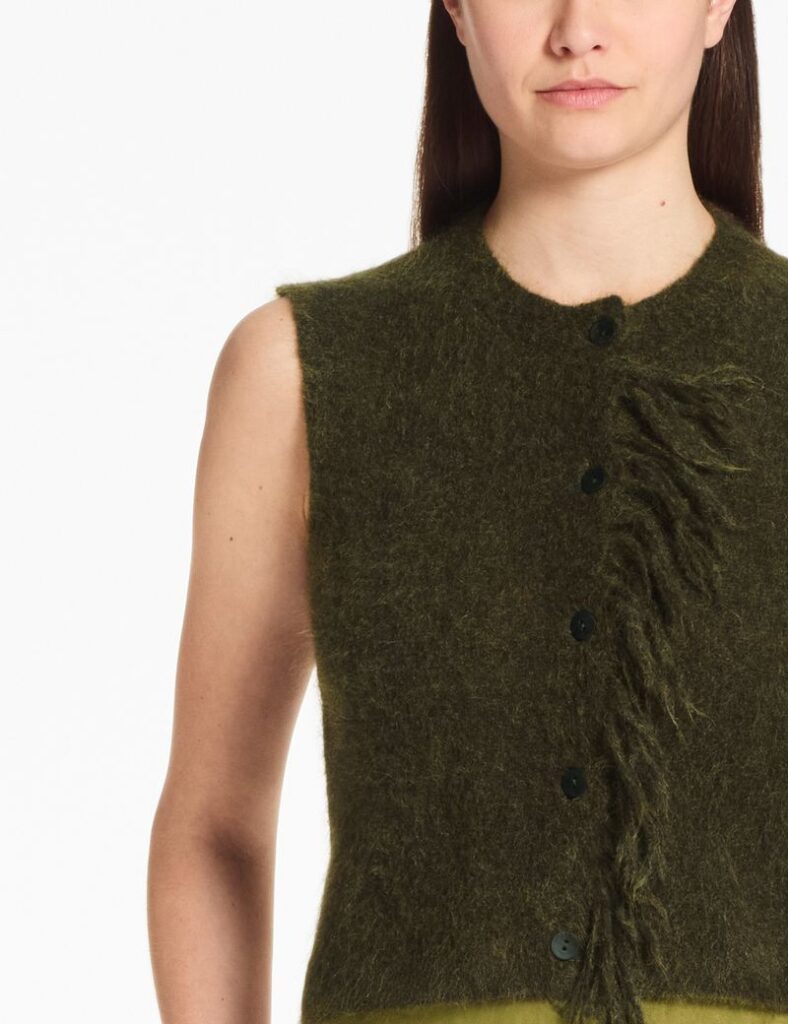 Deze korte, mouwloze cardigan combineert een luchtige soepelheid met een stevige, hoogwaardige structuur. De vervilt mohairtextuur voelt zacht aan op de huid, terwijl de franjes langs de sluiting subtiele beweging en karakter toevoegen. Een comfortabel en elegant item dat aanvoelt als een tweede huid — ideaal voor gelaagde looks in elk seizoen.